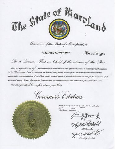 In 2017, Governor Hogan presented the Governor's Citation Award to the ShowStoppers and County Executive, Steven Schuh, presented the Executive Citation to the ShowStoppers.