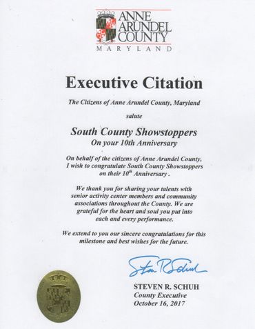 County Executive, Steven Schuh and the citizens of Anne Arundel County, congratulate the South County ShowStoppers on their 10th Anniversary. We thank you for sharing your talents with senior activity center members and community associations throughout the County. We are grateful for the heart and soul you put into each and every performance.